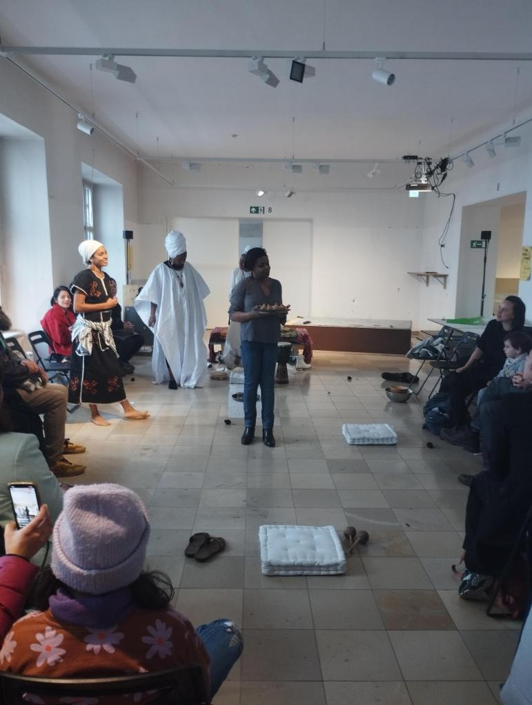 17:00-17:50 Uhr: Rituals für Liberation. Teilnehmer*innen: Vivian Crespo Zurita, Mariama Nzinga Diallo, Araba Evelyn Johnston-Arthur und Lia Kastiyo-Spinósa (Eingang des Volkskundemuseums)