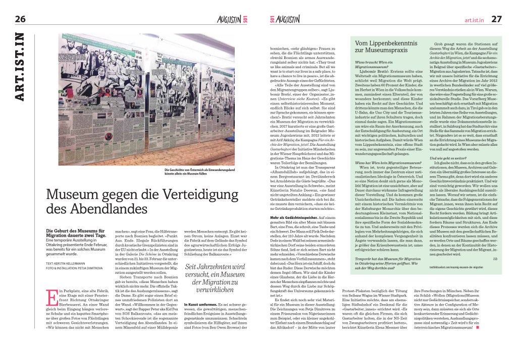 In der Wiener Straßenzeitung Augustin Nr. 501 vom 11. März 2020 erschien ein langer Artikel von Kerstin Kellermann zur „Geburt des Museums der Migration“ mit dem Titel „Museum gegen die Verteidigung des Abendlandes“:
