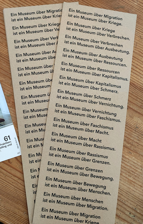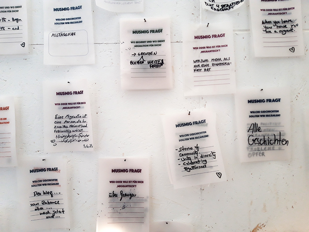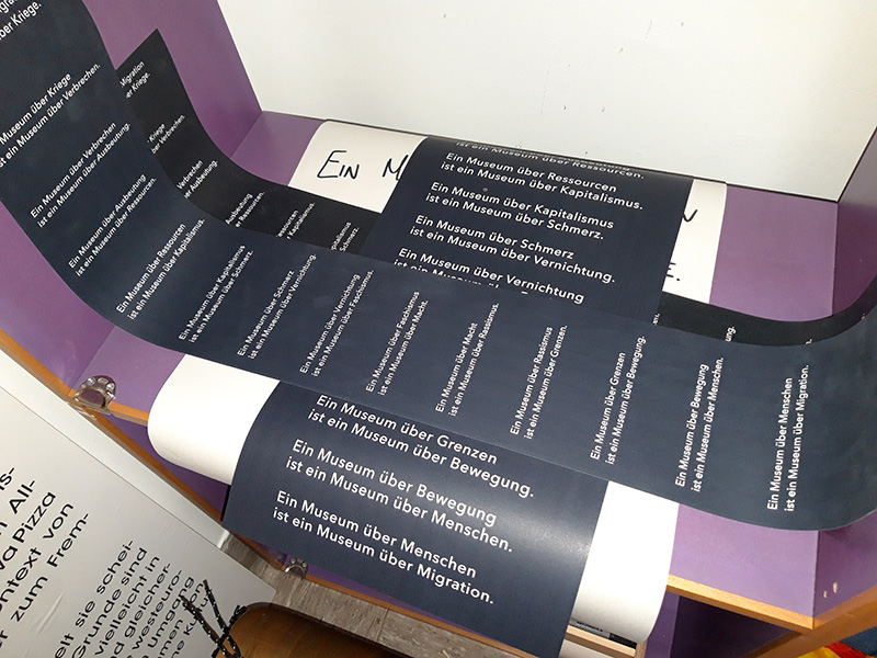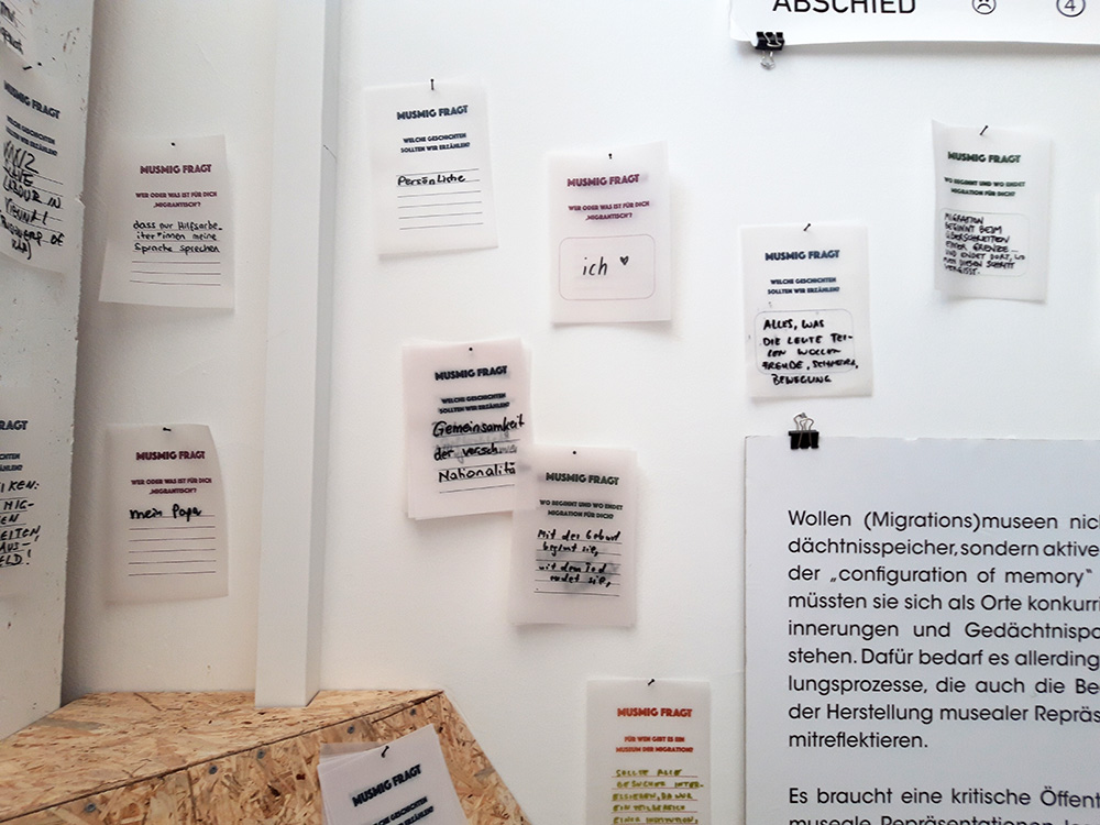 Zusammen mit Natalie Deewan und Anna Seidel von MUSMIG entstehen so in kollektiver Zusammenarbeit neue Manifeste für ein Museum der Migration in Österreich, die auch in die bestehende Ausstellung von MUSMIG wandern können. Aus scheinbaren „Abzweigungen“ wird dabei, wie auch im Ausgangsmanifest, ein Strang, der die heterogenen Forderungen unterschiedlicher Menschen an ein Museum der Migration in Österreich verbindet und ihnen gleichwertige Relevanz zuschreibt.